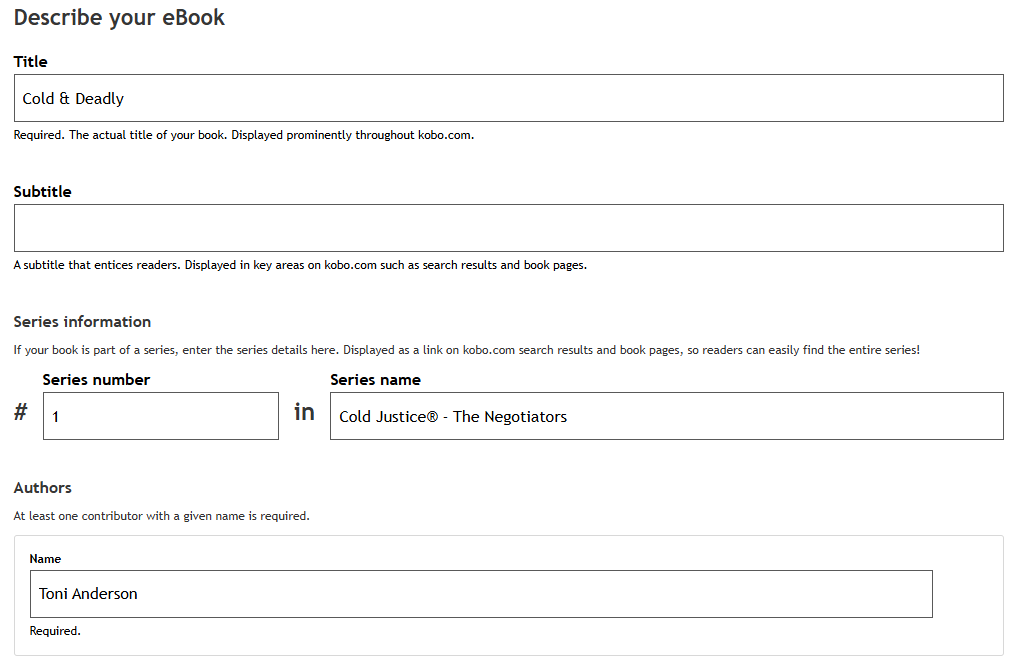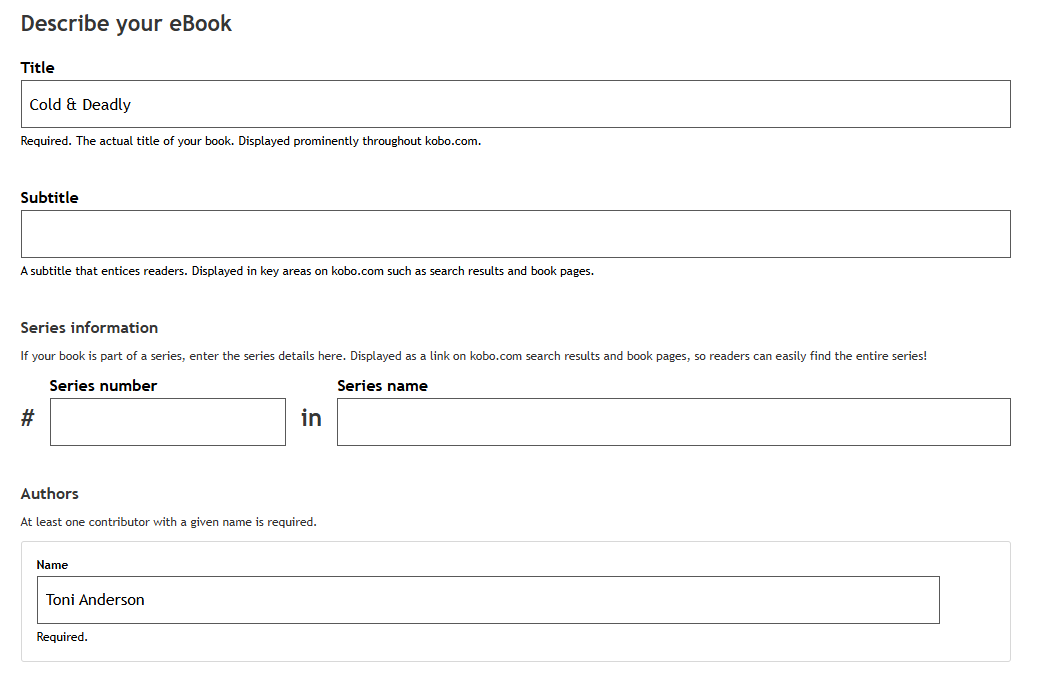 Enter your Series Name. Please be sure to enter the exact same text in the Series Name field for all books in your series so that they match.