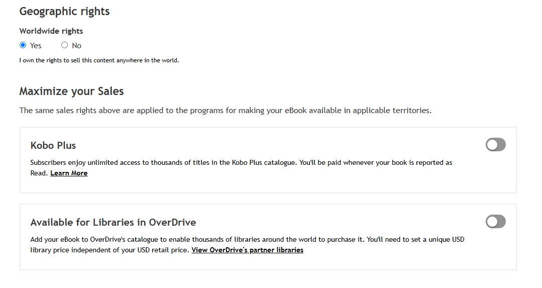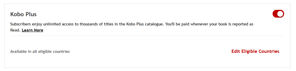 By default your book will be opted into all eligible countries. This will make your book available for Kobo Plus in all available territories, including new territories we add in the future.