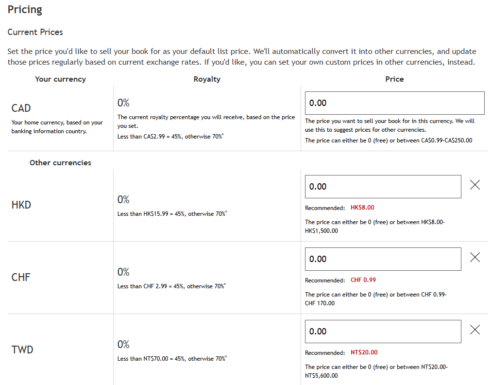 5. To make your book permanently free, enter 0 in your currency then change any other currencies you would like to be free.