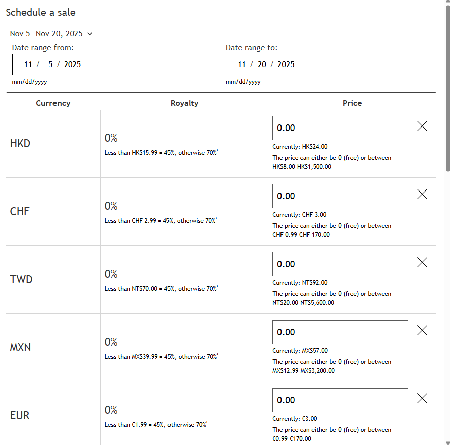 Provide the start and end dates for the sale, and input 0 for each currency in which you would like your book to be listed as free.